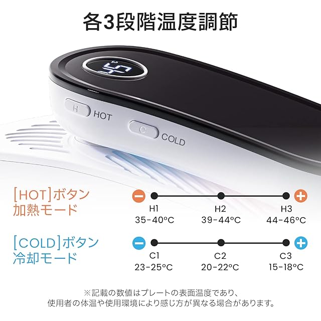 【6段階温度調節】 ポータブルクーラー本体のボタン1つで「COLD」と「HOT」の切り替えが可能。「COLD」では冷却モードとなり、C1/C2/C3(約25℃/20℃/15℃)の3段階から温度を調節できます。「HOT」ボタンで加熱モードとなり、H1/H2/H3(約39℃/42℃/46℃)の3段階から温度をお選びいただけます。※ご注意:数値はプレートの表面温度であり、使用される方の体温や使用環境によって感じ方が異なる場合がございます。