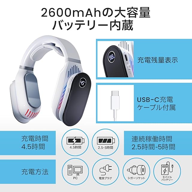 【電池長持ち&LEDディスプレイ表示】この首掛け式扇風機には2600mAhの大容量バッテリーが内蔵されています。2.5時間~5時間の長時間連続で稼働します。目安としては、最大冷却・加熱設定のC3/H3で使用した場合約2.5時間、最小冷却設定C1で使用した場合約5時間連続で稼働します。充電は付属のUSB TypeCケーブルから充電でき、約4.5時間でフル充電が可能です。電源プラグ、PC、モバイルバッテリー、シガーソケット等からどこでも充電ができます。また簡易クーラー本体にはLEDディスプレイウィンドウがついており、充電残量、温度、設定モードを一目で確認できます。ディプレイ表示はOFFにすることも可能でバッテリーの節電にもなります。