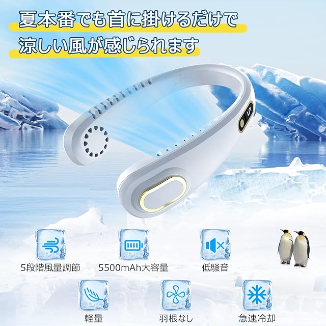 【超長持続使用時間】ネックファンは5500mAh大容量のバッテリーを搭載し、最大持続使用時間16.5hに達しています。「5段階-超強風モード」では最大連続使用時間が6.5hになっております。ネッククーラー1つで朝から晩までひんやりして真夏の暑さを感じなくなります。