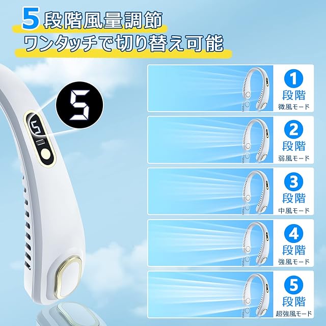 【5段階風量調節】改良版の首掛け扇風機は5段階風量調節可能で、自由に風量を調節することが可能です。6500rmpの最大回転速度と大送風口設計で風力を更に強くさせます。瞬間に体感温度を下げ、夏の蒸し暑さを解消します。