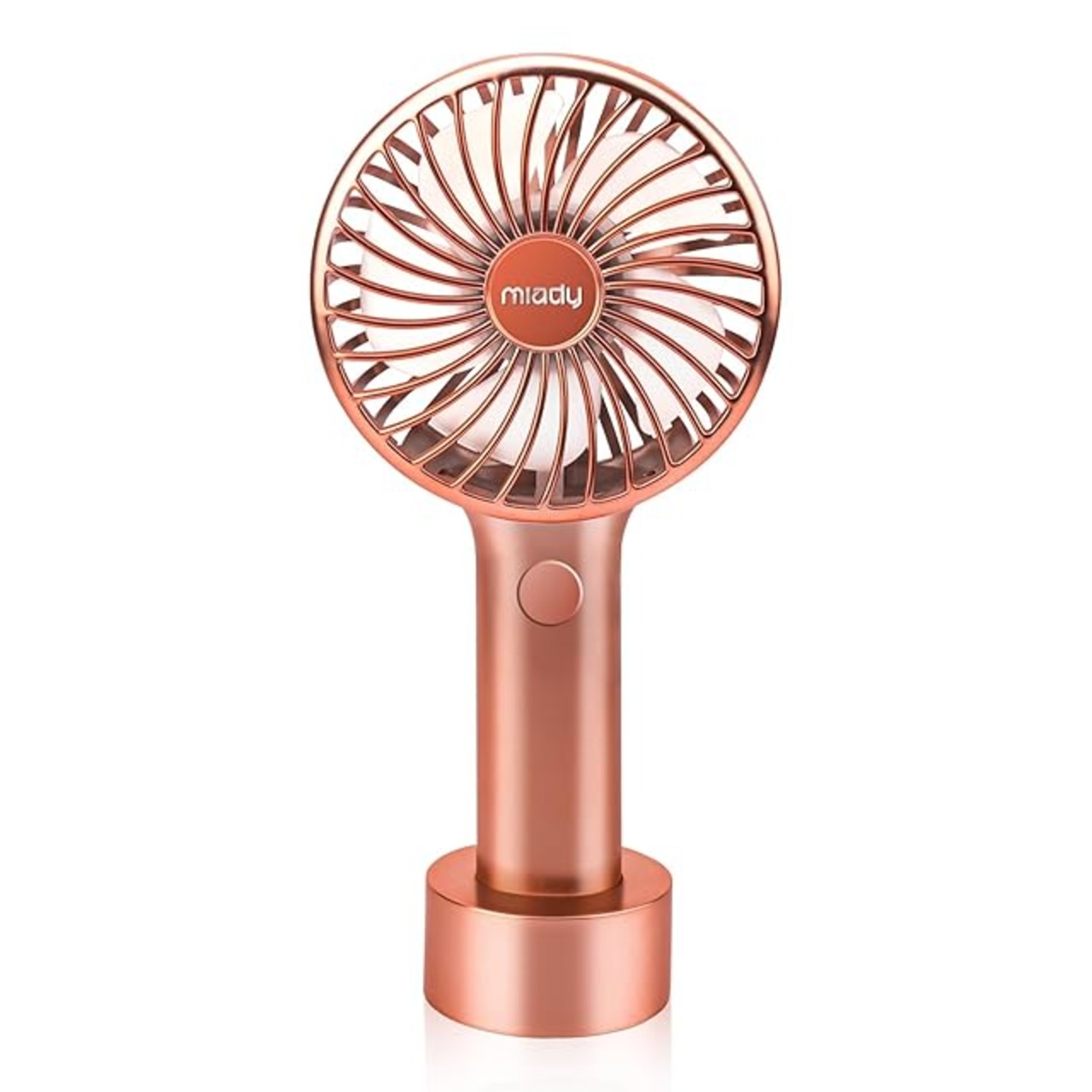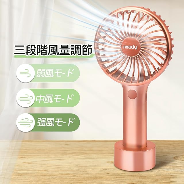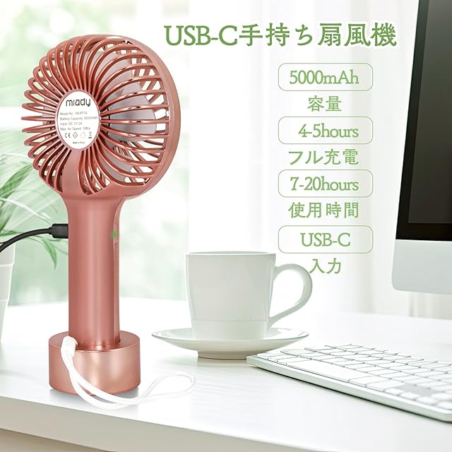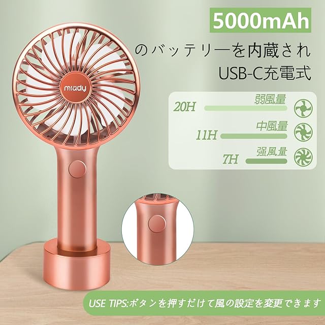 Miady 携帯扇風機 5000mAh大容量 3段階風力調節 USB-Type C充電式 ハンディファン 持ち運び 20時間動作 5枚羽根 小型 軽量 強力 コンパクト スタンド機能付き 手持と卓上両用 (オーロラローズゴールド)