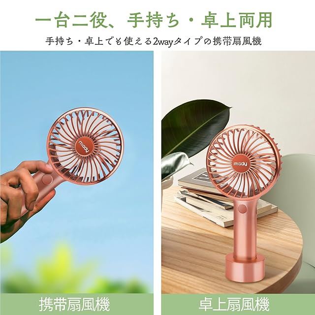 【手持ち/卓上両用】専用スタンド付きで、ハンディファン/卓上扇風機2つの機能を同時に備え、熱い夏を乗り越えるために最適の商品です。携帯扇風機は手持ち扇風機・卓上扇風機2つの機能を同時に兼ね備えています。ベース台を取り付ければ、卓上扇風機としても使用でき、旅先でお風呂上がりに涼むのにもぴったり。ベース台から取り外すと手持ちファンになり、外出時快適に使えます。小さいのにパワフルで夏の様々なシーンで蒸し暑いトイレの中でもお役立ち。