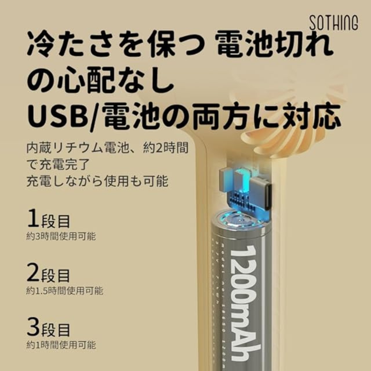 【大容量&3段階風量調節可】1200mAhのバッテリーを内蔵され、容量も十分ありますので、充電頻度も少なくて済むこのハンディ扇風機は弱-中-強の3段階風速モードがあり、風量切替ボタンを押すたびに、自分に適切な風速モードを選べます。熱中症、発熱、あるいは日焼けしている場合はこの小型扇風機を使いながら体の温度を下げることができます。