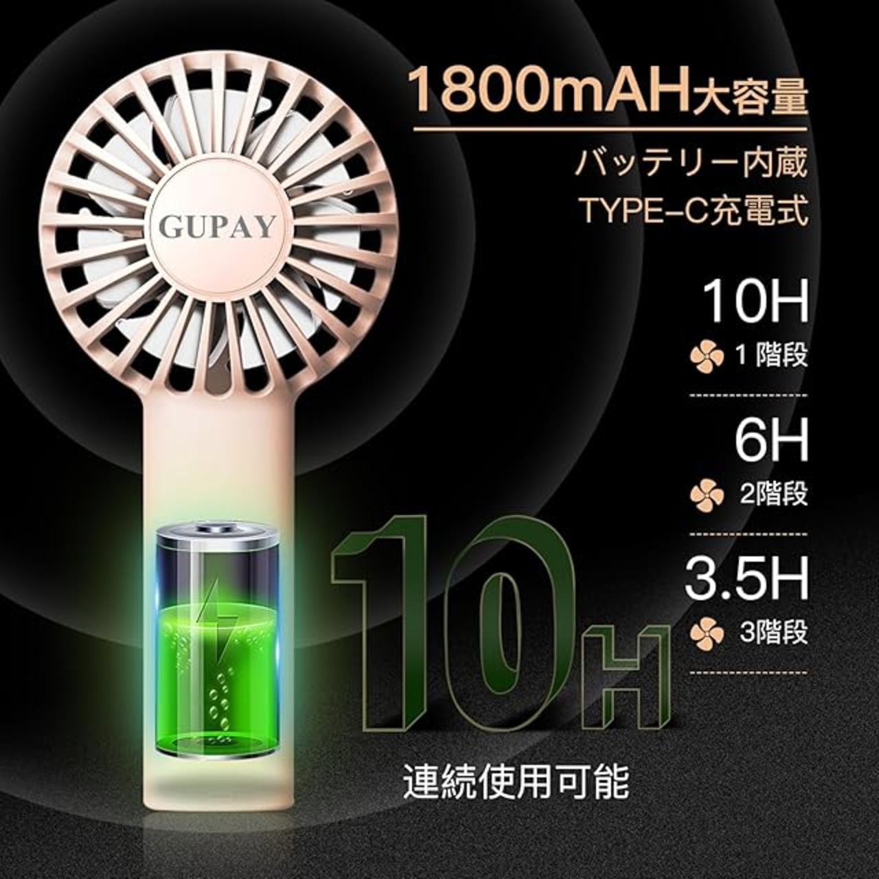 【TYPE-C快速充電・1800mAh大容量・Max10時間連続稼働可能】TYPE-C充電式扇風機は1800mAh大容量バッテリーを内蔵し、本体はType-Cポードがあり、コンセント・パソコン・車・モバイルバッテリーで充電できます。パッケージに充電用のUSBケーブルがあります。完全に充電するにはわずか3時間しかかかります。最大使用時間は約10時間で、持ち運びに適しています。外観もおしゃれで、女の子、男の子、子供、親友への理想的な夏ギフトです。