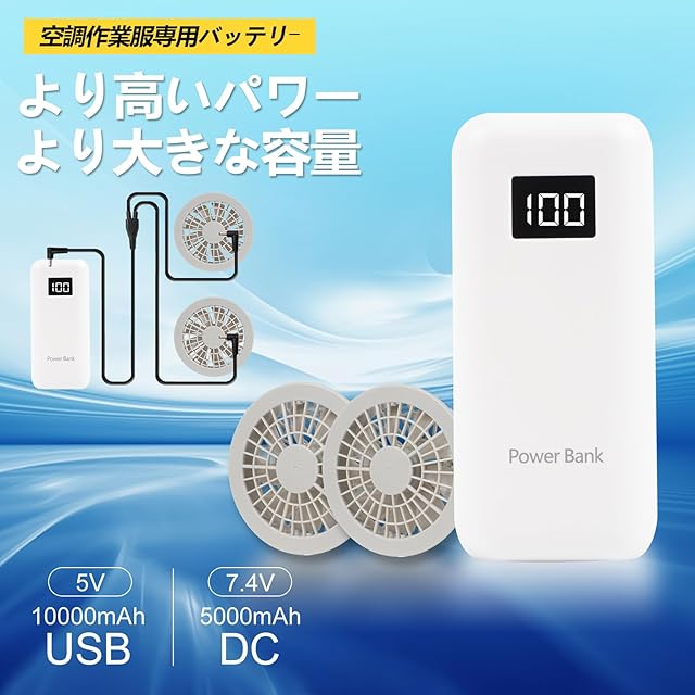 扇風機付き服電池 製品仕様: セット内容:バッテリー<br> 容量:5V 10000mAh/7.4V 5000mAh USB入力:5V Micro USB USB出力: 5V 2.1A <br> DC出力: 7.4V 2.0A 出力切替:風量3段階<br> 種類:リチウムイオン電池<br> サイズ:11×5×2.5cm 重量:約178g 使用時間目安 風量3(强):約8時間 風量2(中):約9時間 風量1(弱):約11時間 (実際の使用状況により異なります)<br><br> <b> 充電時間 充電アダプタ出力1A:約10時間 2A:約5~6時間 こんな方にオススメです: 太陽に長時間さらされた建設作業員 暑い夏でも移動する必要がある宅配便 エアコンなしの倉庫作業員 釣りが好きで、よくアウトドアスポーツをする人 ゴルフは好きだが発汗は嫌いな人 鉄道員 ガーデニング活動が好きな人、またはガーデナー セット内容 空調作業服 バッテリー 7.4V 5000mAh x 1 (エアコン服、充電コード、 ファンを除く)