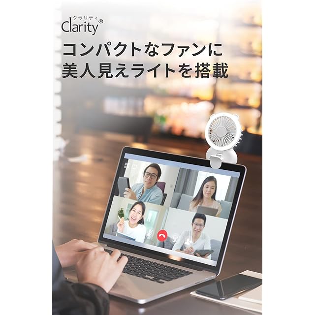 Clarity(クラリティ) 小型 扇風機 クリップ ハンディ 卓上 2way ハンズフリー LED リング ライト付き ファン ミニ コンパクト f2106WH