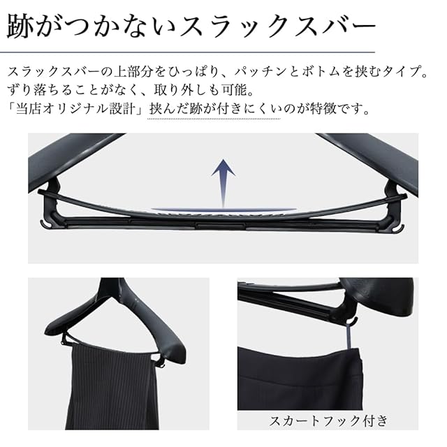 【商品特徴】ポリプロピレン素材を使用した、スタンダードなハンガーです。 スーツ・ジャケット等型崩れすることなくスッキリおさまるように設計しました。スラックス止めが付いている物はたくさんあると思いますが、スラックスをきつくプレスすることなく、落ちることなく、程よくパッチンしてくれます。厚みもほどよく、しっかりあり、型くずれしません。