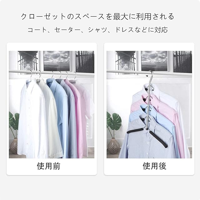 【 滑らないハンガー】 滑りにくい素材であるゴムコーティングにより、シャツハンガーは滑り止めに優れ、服の滑りや服の脱落ことはありません。それに、手触りがとても柔らかく、服を傷つけません。