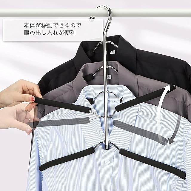 【360°回転フック&滑り止めバー】シャツハンガーのフックは360度回転可能で、どんな角度の物干し竿にも適用で、服の取り掛けにもとても便利です。また、この収納用ハンガーは弾力あるEVAフォーム付きで、服の脱落を防ぐことが出来ます。シャツの落下を心配しなくていいです。(PS:ご使用の初期階段は回転部分が硬くて回転しにくいですが、品質や使用上には問題ありません。通常使用しているうちに回転しやすくなってきます)