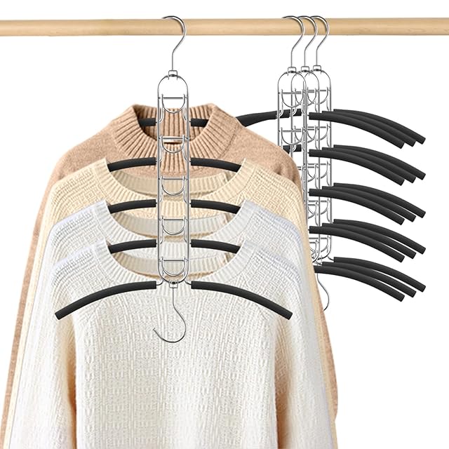 【縦横両用&省スペースハンガー】多機能ハンガーは5層着脱式また縦横両用なので、簡単に掛つけます。縦にかける時、通常の約2倍の衣類を収納できます。スーツ、ジャケット、コート、セーター、パンツ、ワンピースなどを5枚まで吊るすことができます。 スペースを80%まで解放し、クローゼットの省スペース化とすっきり感を最大限に引き出します。このようなハンガーは主婦には手放さないおすすめ商品です。