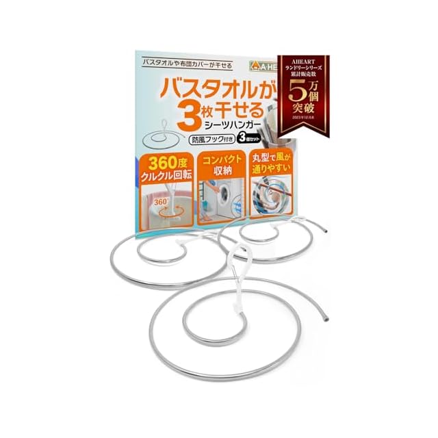 ✅【特徴】 プロの洗濯家が監修した、360度回転しフックが折り畳めるシーツハンガーです。幅43cmで200cm分の長さのシーツ類を干せ、水平に回転するので干しやすく取り入れやすいうえに風に任せて回転するので乾きやすいです。フックを付け根で折りたためるのでコンパクトに収納が可能です。