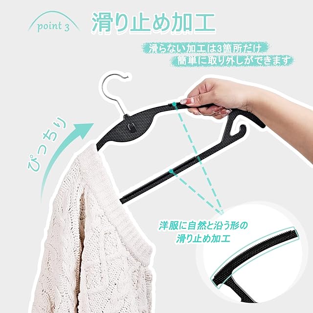 【薄型ですべりにくいアーチ形ハンガー】SEWEI洗濯ハンガーの滑らない加工は肩部分と下側に3箇所だけです。衣類の取り外しがしにくく使いにくいと感じることがないんです、簡単に取り外しができます。ハンガーは肩ヒモやスカートのウエストヒモが引っかけられる小さなフックが付いているのもポイントです。キャミソールなどの肩紐タイプの衣類にも便利にご使用いただけます。