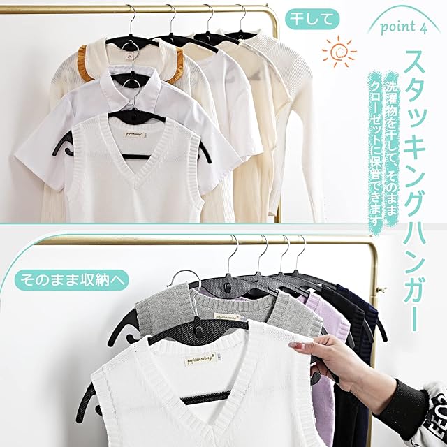 【360°回転フック&スタッキング機能】ハンガーフックの部分は、合金鋼が使われているのでサビにくく、360度回転できるため、横掛け・縦掛けの両方に対応できます、方向を気にすることなく使えて便利です。ハンガーフックの下には小さな連結用フックが付いているため、ジャケットとスカートを重ねて1着分のスペースで収納できます。クローゼット等の収納スペースを最大限に活用することができます!!