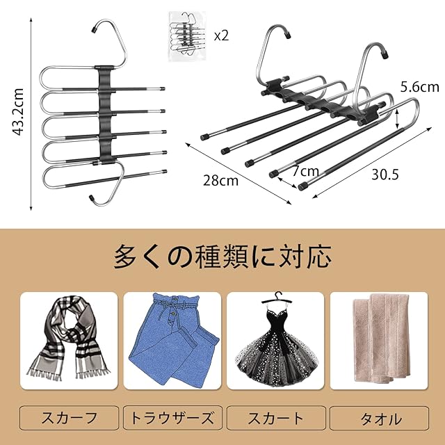 「省スペースパンツハンガー」- 5段階のズボンハンガーで、最低でも5本のジーンズ、ズボン、その他の衣類を収納できます。衣装室のスペースを最大限に節約し、清潔で整然とした状態を保ちます。強い耐荷重で形状が変わりにくく、長持ちします。
