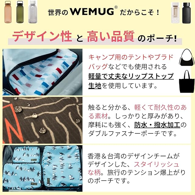 【WEMUGのトラベルポーチ】オシャレなデザインのポータブル(携帯)ボトル ブランドのWEMUG。アウトドアからオフィスまで、機能的でありながらファッション性を兼ね揃えたデザインが、世界中で幅広く支持されているWEMUGから、便利なトラベルポーチが登場!高いデザイン性と高機能ボトルで定評のあるWEMUGだからこその、カワイイ&高機能な旅行用ポーチ、HANDシリーズです。