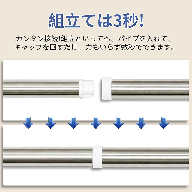 【伸縮物干し竿】:縮式 1本あたり(約)2.1~3m、ジョイント式/最短(約)1.16mだから持ち運びに便利です。両端部伸縮可能/最長(約)3mまで伸ばせます。スペースに合わせて長さを調節いただけます。収納・持ち運びの際は、竿を2本に分けてコンパクトに。