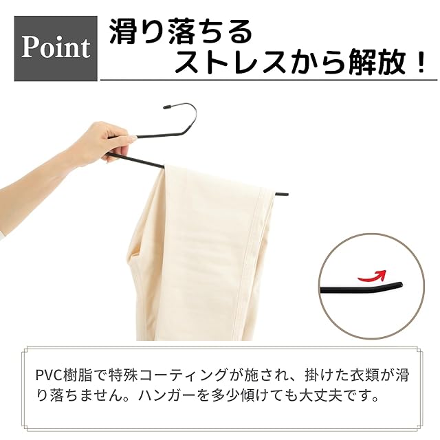 【本当に滑らない!】スチール製のハンガー本体にPVC樹脂で特殊コーティングが施され、掛けた衣類が滑り落ちません。ズボンやスカートだけでなくマフラー、スカーフ、ネクタイなどの小物を収納するのにも便利です。片側がオープンになっており、ラックにハンガーをかけたまま、かけたり取り外せたりできる向きになっています。