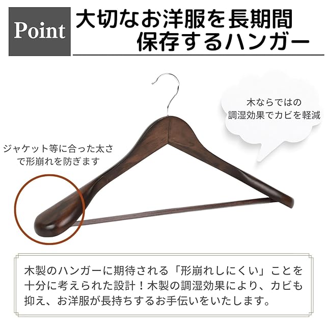 【大切な洋服を長期間保存するためのハンガー】大切なジャケット・スラックス・コートを形崩れさせることなく、保存するための木製ハンガーです。肩部分は太く、丸みを帯びてジャケット等に合った太さになっており、形崩れを防ぎます。また、木ならではの防湿作用があり、湿度が高くなって洋服がカビたりすることも抑える効果が期待できます。木製はPVCやスチールなどの他の素材より劣化が遅く、ハンガーの屑等が洋服に着くことがありません。耐荷重も20kgまで充分に耐えられる仕様になっており、一般的なスーツの上下は約1kg、重めの冬用のウールコートでも1〜2kgですので、ハンガーがたわむことなく、長期間問題なく支えることができます。 ※フック部分もメッキで錆びにくい加工をしております。