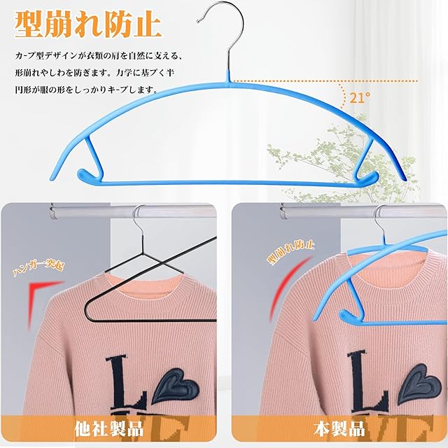 【アークタイプの跡がつ無しス設計】ハンガーは衣服を吊るした後、両側の突出部分を取り除くように、力学の原理により両側に円弧を配置して設計されています。丸みをおびた形が型崩れしやすいニットや薄手のトップスも美しくキープ!この形を採用することで、洋服の肩部分に掛かる力を分散し、部分的に過度な力が掛かるのを防いでくれるのです。型崩れしやすいセ―ター、ニット等にも対応しています。衣類の保管時だけでなく、洗濯後に乾燥させる際にもかたくずれの防止効果を発揮します。