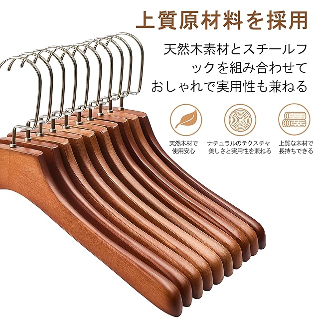 【360°回転フック、サビ防止】木製ハンガーのフック部分は360°回転するので、角度を自由に調整できます。アイロンをかける際には、ハンガーから衣服を取り外す手間なく回転させることができますので、優れた便利性を持ち合わせています。さらに、このハンガーのフックはクロームメッキで錆びにくいです。