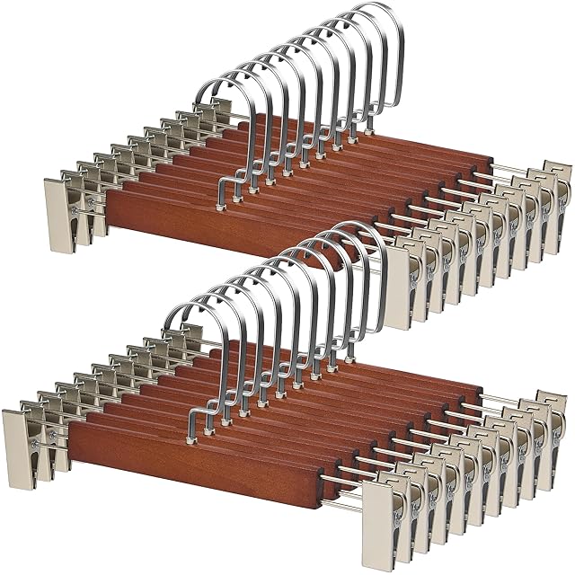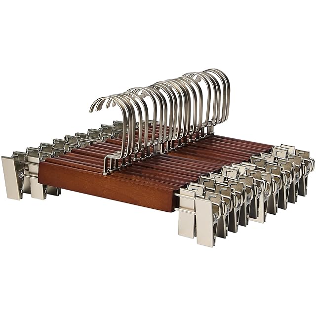 【すべ落ちない】:ボトムやスカート、マフラーなどに最適な、クリップで挟むタイプの木製ハンガー です。ステンレスてつ製のフックはご都合によってできます。また、耐久性と滑り落ちない機能性を兼 ね備えています。