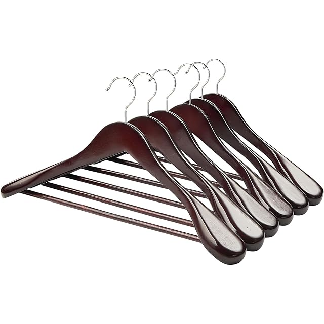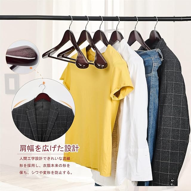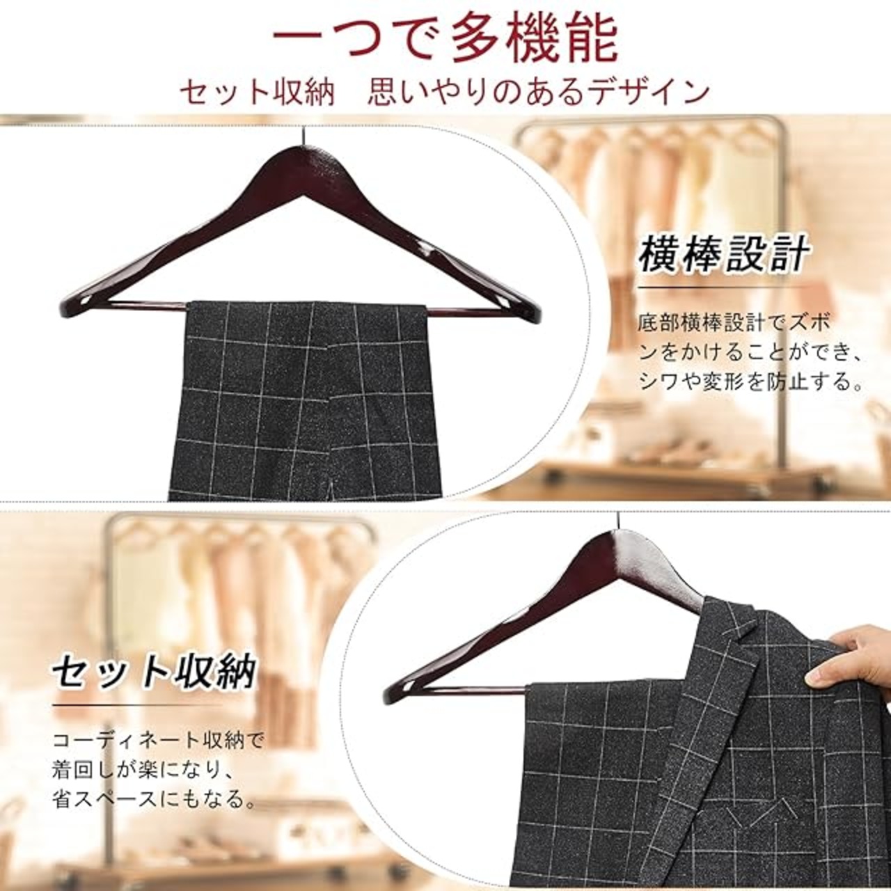 【木製スーツハンガー】当木製ハンガーはジャケットとスラックス、ネクタイを一緒にかけられるため、余分なスペースを取ることがありません。肩掛けラインの角度は人に肩に近い形状に設計することで、衣類の型崩れが防止できます、常にスーツのきれいな状態をキープ!自然の質感とおしゃれさを兼ね備えたハンガーが衣類ケアにも優れています。自宅のクローゼットにはもちろん、ショップなどで服の最も良い状態を示すためにもおすすめです。