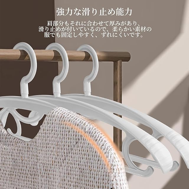 ハンガー かたくずれ防止: 洗濯ハンガーの肩部分には複数の滑り止め溝が丁寧に設計されており、滑り止め効果があり、滑りやすいジャケット生地でも落ちにくいです。