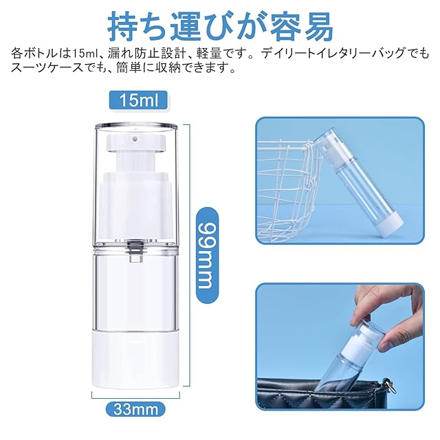 トラベルボトル:内容量:15ml。色: 透明。サイズ:直径:33mm; 全高:99mm。真空ポンプボトルのため、最初乳液をボトルに注入した後、空気を排出する必要があります