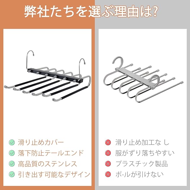 【滑り止めハンガー&上質な素材】高品質の防錆ステンレススチールと高品質のABSプラスチックで作られています。ハンガーが歪まず、安心して使用できます。スペースセービングパンツハンガーの最大耐荷重は6本のパンツに対応しています。掛けた服の落下を防ぐ6つの滑り止めのゴムカバー先端に付いており、安定性を高めて、ズボンをより安定に掛けられます。