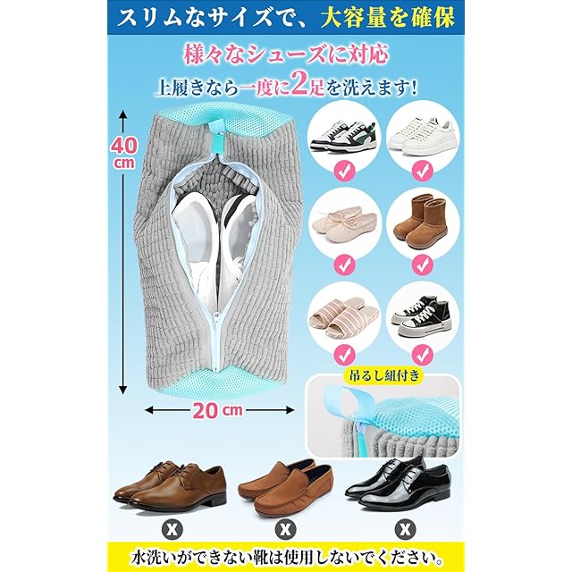 【スリムなサイズで、大容量を確保】靴用洗濯ネットのサイズは長さ40cm、直径20cmで、あらゆる靴のサイズに対応しています。子供靴から大人靴、お年寄りの靴まで、簡単にランドリーバッグに入れて洗うことができます。ランドリーバッグの内側は十分なスペースがあり、どんなサイズの靴でも収納できるため、靴が洗濯ネットに収まらない心配はありません。様々なシューズに対応上履きなら一度に2足を洗えます!水洗いができない靴は使用しないでください。