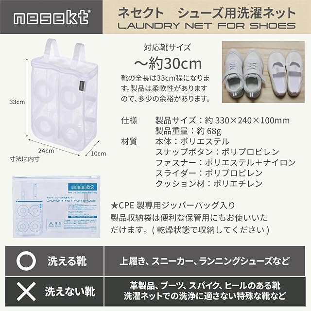 【完全新設計!大容量タイプ】従来品よりも大幅に余裕のあるサイズ設計として、30cmサイズの靴まで対応します。横幅にもゆとりがあるので、従来品では洗えなかったハイカットのスニーカーを入れることも可能です。前面にはnesektブランドタグつき。