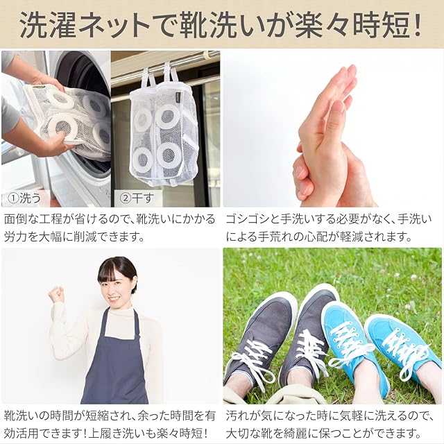 【製品仕様】 ・サイズ(内寸) 横幅240mm×高さ330mm×奥行100mm ・パッケージ 専用ジッパーバッグ入り ・サイズ表記 30cm程度の靴まで対応 ・洗濯機での洗浄に適さない靴もございますのでご注意ください。 〇 布製、キャンバス生地の靴など × 革製、スエード生地の靴、装飾などが施された靴など ※ドラム式洗濯機にも対応しておりますが、洗濯機の説明書を優先してください。 ※洗濯機での乾燥は行わないでください。