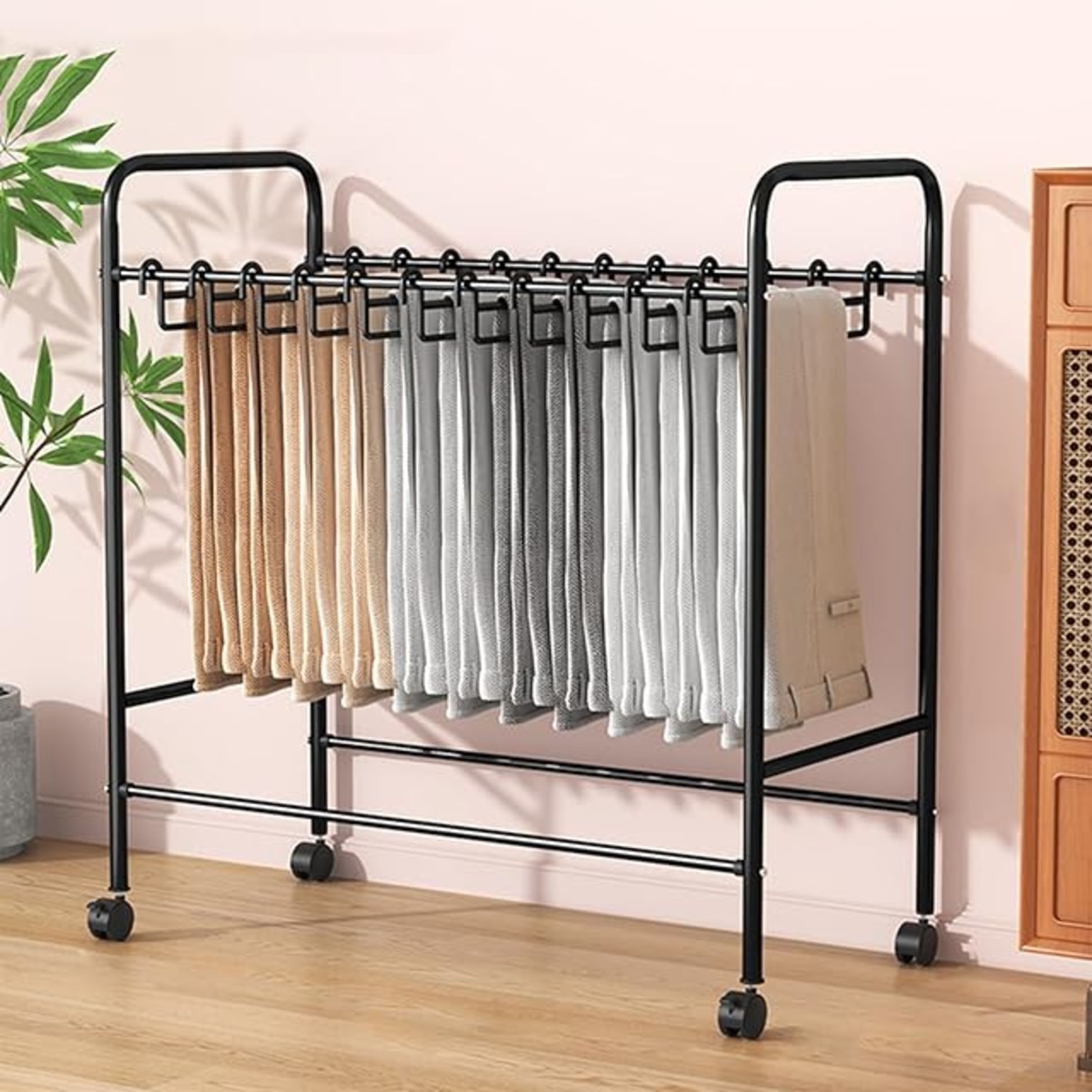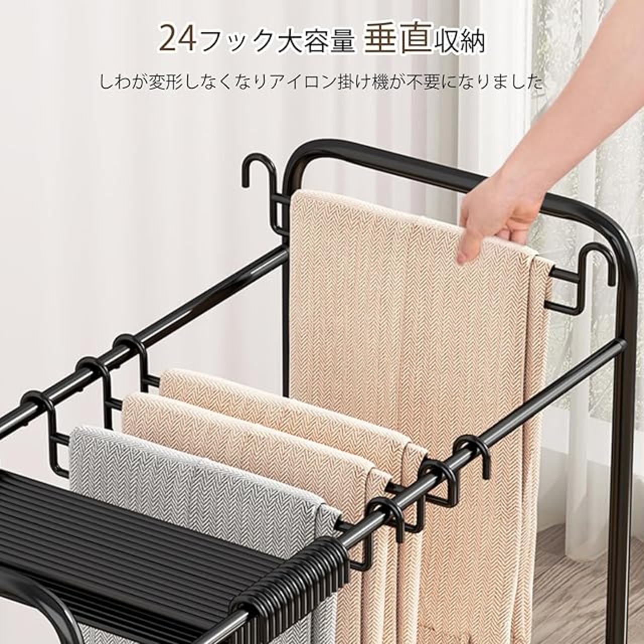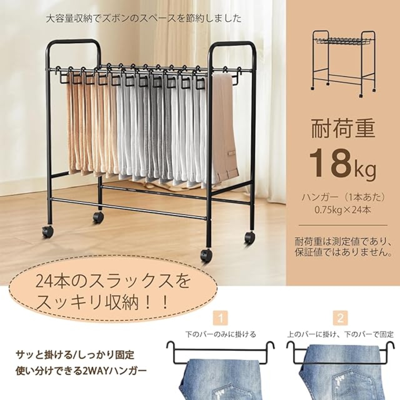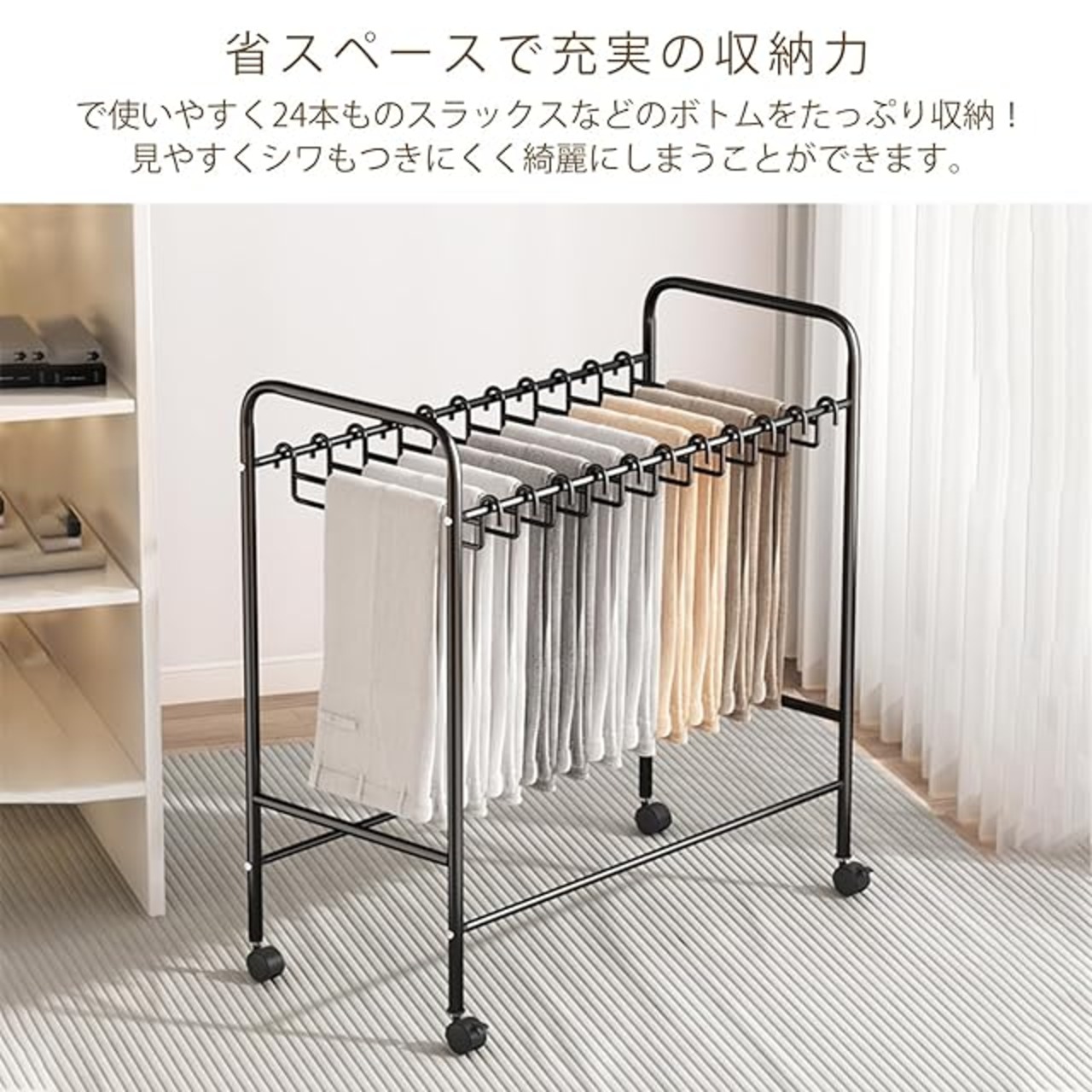 スラックスハンガー ハンガーラック 24本掛け キャスター付 ズボンハンガー 大容量 衣替えカンタン 取り外し可能 パンツハンガーラック 幅60×奥行36.5×高さ75cm 軽量 頑丈 コンパクト パンツ収納 簡単組み立て (ブラック)