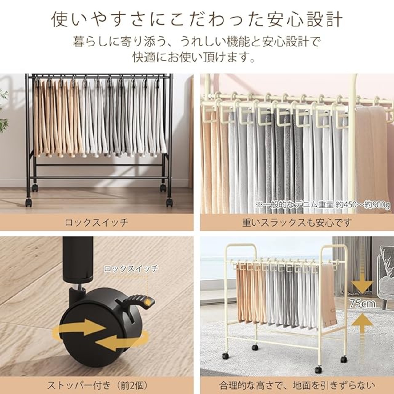 【キャスター付きズボンラック】スラックスハンガーの寸法は奥行75×幅36.5×高さ75cm。4つのキャスター付きにより、ズボンラックを便利に移動できます。ズボンラックには車輪を所定の位置に保持するブレーキが2つ付いています。キャスター付きズボンラックは、ニーズに応じて寝室、バスルーム、ランドリールームに移動できます。
