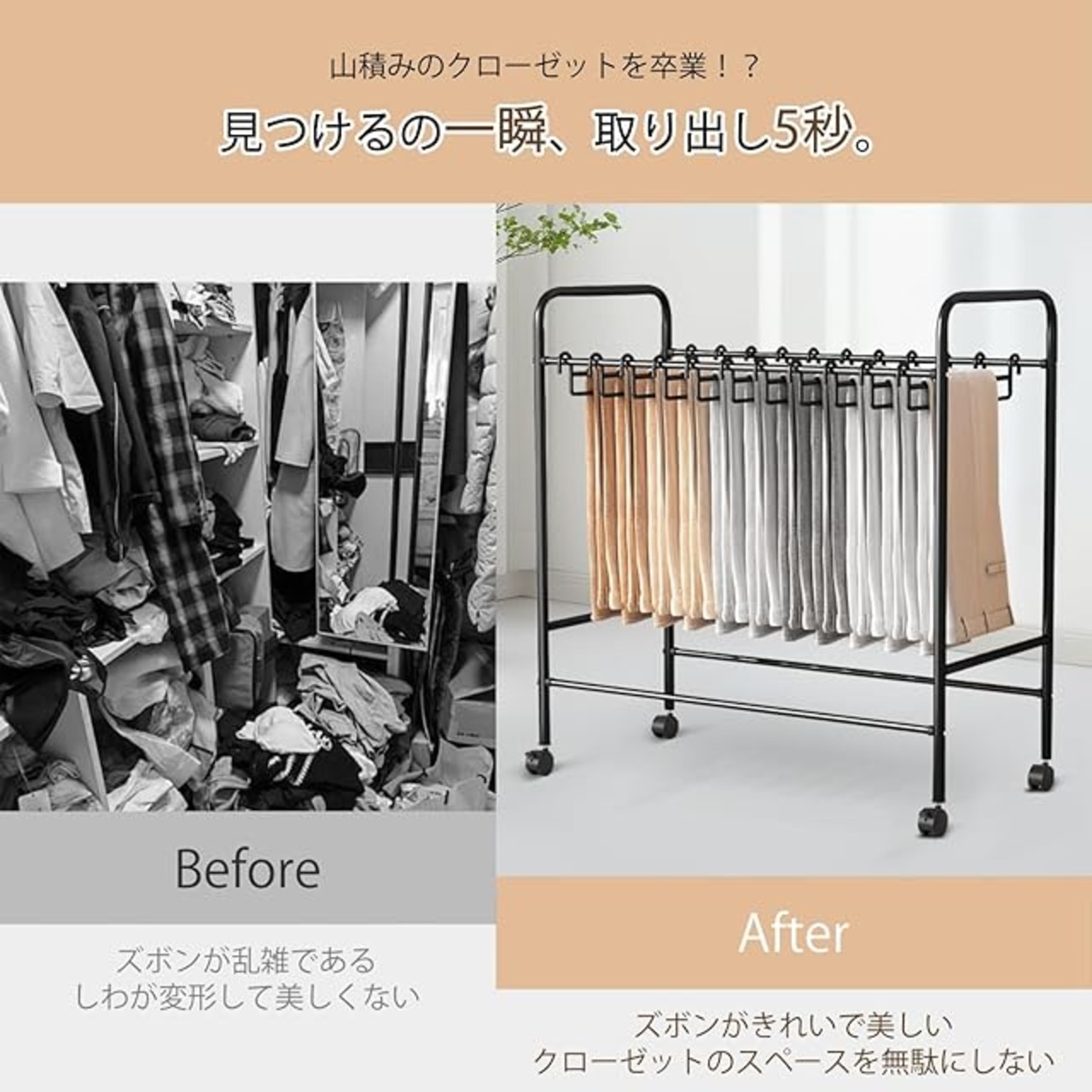 【衣服の出し入れが簡単】ズボンラックには付属品が付属しており、簡単に組み立てられます。ハンガーは取り外し可能。本体の両端のパイプに引っ掛けるだけだから、すぐに取り出せて収納するときも 簡単に本体に引っ掛けることができます。 ズボンをかけたハンガーを上から引っ掛けるだけの簡単収納。