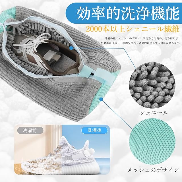 【効率的な洗浄機能】靴洗濯ネット内部は2000本以上のシェニールマイクロファイバーを採用し、手ブラシのような綿毛柱を形成し、3D構造は通気性と衛生性だけでなく、靴の甲を優しくこすり、効率的に汚れを取り除くことができます。靴洗濯ネットの外層の粗いメッシュのデザインは洗浄力を高め、洗浄剤と水が簡単に浸透し、頑固な汚れを効果的に除去するのに役立ちます。