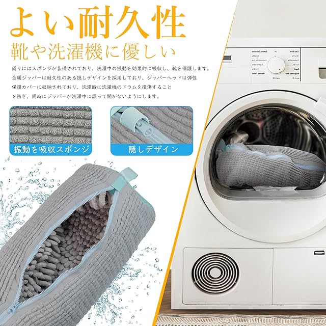 【よい耐久性、靴や洗濯機に優しい】靴洗濯ネットの周りには丸いスポンジとサイドスポンジが装備されており、洗濯中に内部と外部からの振動を効果的に吸収し、靴を保護し、騒音を低減し、同時に洗濯機の損傷を防ぎます。靴洗濯ネットの金属ジッパーは耐久性のある隠しデザインを採用しており、ジッパーヘッドは弾性保護カバーに収納されており、洗濯時に洗濯機のドラムを損傷することを防ぎ、同時にジッパーが洗濯中に誤って開かないようにし、靴をより包括的に保護します。