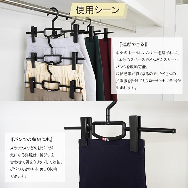 【シンプルで使いやすい!ベーシックハンガーシリーズ】スカートハンガーの定番!両面ゴム質樹脂(すべり止め)付きのロングクリップが洋服をしっかりキャッチ!洋服のより深くをクリップするので、厚手の洋服もしっかりキャッチします。また中央のホール部分に別のハンガーのフックを掛けると連結できるので、1本分のスペースで多くの洋服を収納できます。スカートだけでなく、スラックスなどのパンツも収納できる、シンコハンガーのロングセラー商品です。