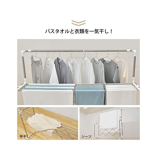 【特長】<br> ● バスタオルが一気に10枚干せるハンモックバー<br> ● 幅も高さも伸縮自在<br> ● 倒れにくい安定設計<br> ● さびにくく丈夫なステンレス製<br> ● 安定・安心の29mmパイプ<br>
