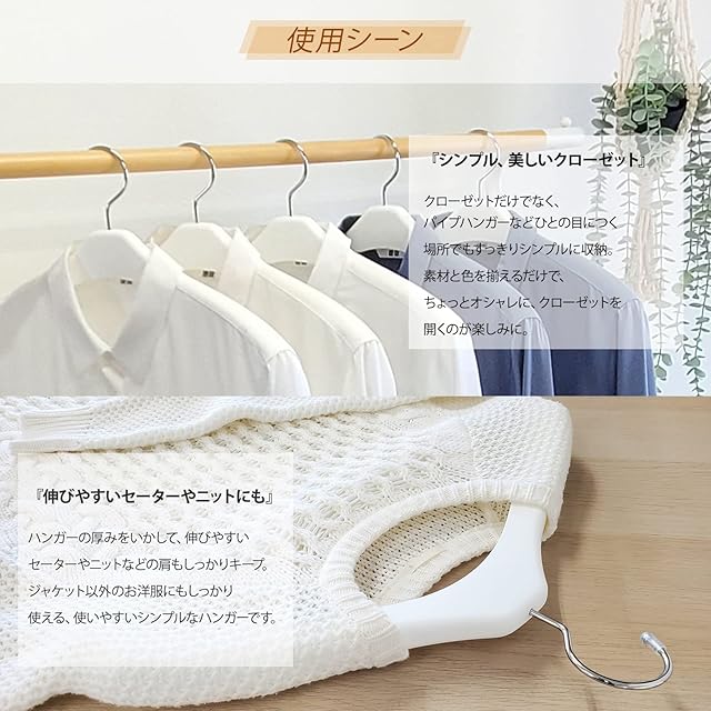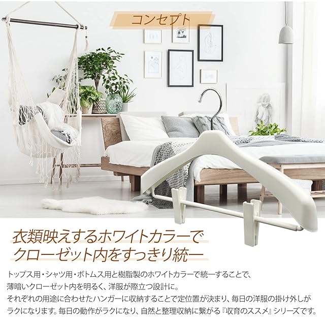 【衣類映えするホワイトカラーでクローゼット内をすっきり統一】 トップス用・シャツ用・ボトムス用と樹脂製のホワイトカラーで統一することで、薄暗いクローゼット内を明るく、洋服が際立つ設計に。それぞれの用途に合わせたハンガーに収納することで定位置が決まり、毎日の洋服の掛け外しがラクになります。毎日の動作がラクになり、自然と整理収納に繋がる『収育のススメ』シリーズです。