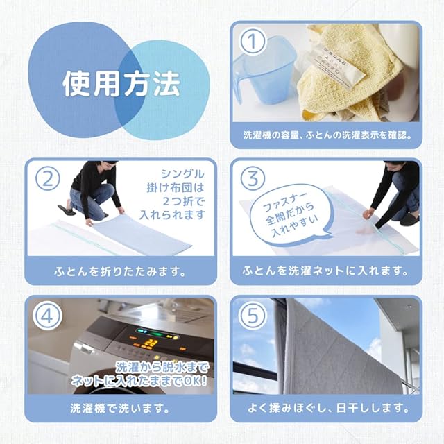 【ネットの上手な使いかた】 ●洗濯物はネット容量の2/3を目安に入れてください。 ●洗濯から脱水までネットに入れたままご使用できます。 ●特に汚れがひどい場合は、あらかじめ下洗いしてからネットをご使用ください。 ●前回洗った洗濯物の糸くずがネットの中に残っていることがあります。糸くずをきれいに取ってからご使用ください。 【取り扱い上のご注意】 ●本製品は家庭用洗濯機専用の洗濯物保護ネットです。洗濯以外に使用しないでください。 ●火のそばや高温になる場所でのご使用、保管はしないでください。 ●洗濯機の取扱説明書をご確認の上、ご使用ください。誤った使い方をすると、ネット・寝具等の破損や洗濯機の故障の原因になります。 ●洗濯物に表示されている取り扱い絵表示に必ず従って洗濯してください。 ●ネットの容量以上に洗濯物を詰め込んだり、先の尖った金属のついた衣類などは入れないでください。ネット破損の原因となります。 ●ファスナーは最後まで閉じてご使用ください。 ●ファスナーの引手は、ファスナーカバーの中に入れてご使用ください。 ●ファスナーは強く引っ張らないでください。破損の原因になります。 ●洗濯物の破損や伝線を防ぐため、ネットから出し入れの際は、ファスナーに引っ掛けないようにご注意ください。 ●ネットに洗濯物を入れたまま乾燥機に入れると、乾きムラやシワの原因になることがあります。 ●タンブラー乾燥機を使用しないでください。 ●ご使用後はよく乾かしてから保管してください。 ●洗濯機の容量を必ずご確認ください。洗濯可能な標準的な容量は7~8kgですが、洗濯機の種類によって異なります。詳しくはお使いの洗濯機の取り扱い説明書をご確認ください。