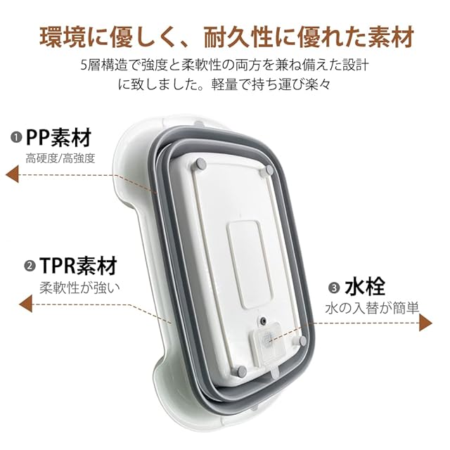 【高品質&無毒無害】底部には水抜き栓がついているので、排水時も本体を傾ける必要がなく、簡単に行えます。耐久性に優れていて、水が漏れません。何度も折り畳めても変形しません。底は耐摩耗設計なので、底部の磨損を有効的に減少し長持ち出来ます。環境に優しいPP素材とTPR素材を使用するため、安全を確保できます。