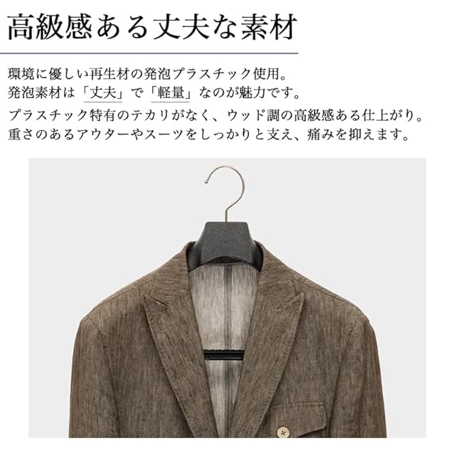 【商品特徴】発泡素材により、薄く木目調の模様を再現したハンガーです。 スーツ・ジャケット等型崩れすることなくスッキリおさまるように設計しました。スラックス止めが付いている物はたくさんあると思いますが、スラックスをきつくプレスすることなく、落ちることなく、程よくパッチンしてくれます。厚みもほどよく、しっかりあり、型くずれしません。バーはスカートフックなし取り外し可能。