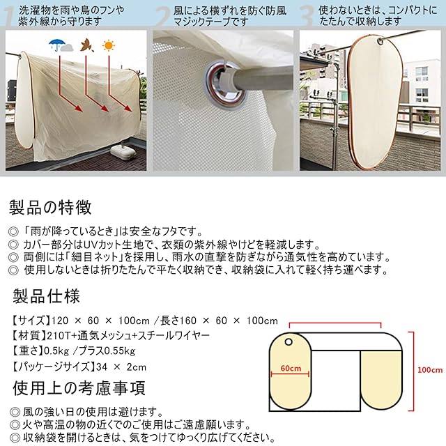 洗濯物カバー ベランダ 雨よけカバー 屋外 カーテン 物干しカバー 幅広 大きめ コンパクト収納 便利 洗濯ネット 通気性が良い 洗濯物保護 日除け 雨天 陰干し 鳥対策 梅雨対策 花粉対策 晴雨兼用 (120*100cm)