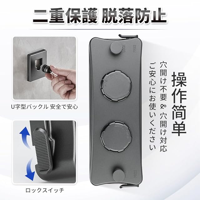 2種類の設置方式:壁に穴を開けても、開けなくても取り付けることができます。穴を開けずに接着剤での取り付けができ、壁を傷付けずお引越しも楽々です。穴を開け必要がある時、専用のネジを付属し、簡単に取り付けることができます。穴開け不要向き壁素材:滑らかなタイル・凹凸のタイル・滑らかな大理石・凹凸の大理石・滑らかなガラス・艶出しガラス(ガラスの強度を考慮する必要があり、慎重に使用してください)・滑らかな金属・凹凸の金属