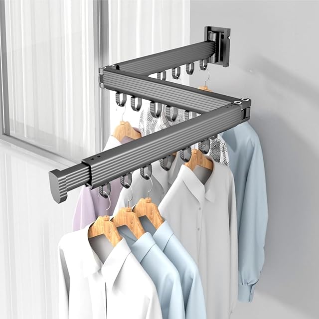 【360°折り畳み式ハンガーラック】360度折りたたみ式、一段ごとに6個のフック、末端は24cm延長伸縮ロッドあり、タオル、ズボン、シャツを掛けることができます。折りたたみ式物干しラックをよりしっかりと壁に固定できるようにする。 180°+360°回転で楽々と衣服を干します。掛けられるものは、服のみだけでなく、帽子やバッグ、鍵など様々です。