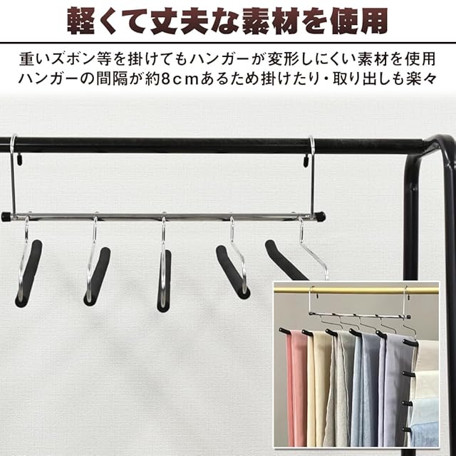 置き場に困るズボン/スラックスをバーに掛けるだけで収納できるスラックスハンガーです。ハンガーに掛けることでシワを防止できるため、省スペースで綺麗な状態で保管できる便利なアイテムです。