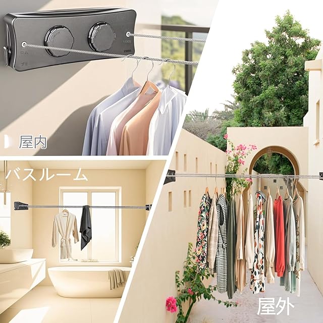 伸縮式物干しロープ 室内外兼用 4.5/5.1m耐荷重20kg 壁掛け設置 ステンレスワイヤー ロープ 防錆・防水 ベランダ 浴室 洗濯室用 省スペースデザイン【穴あけ不要対応】 (ブラック, ダブルロープ) | ascend