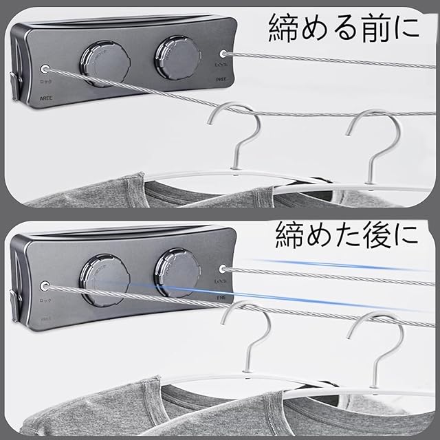 ✅ ワンタッチでロック&たるみ防止設計 ロープを引き出してロックボタンを押し、ダイヤルを回すだけでピンと張れます。たくさん干してもたるみにくく、ストレスフリー!