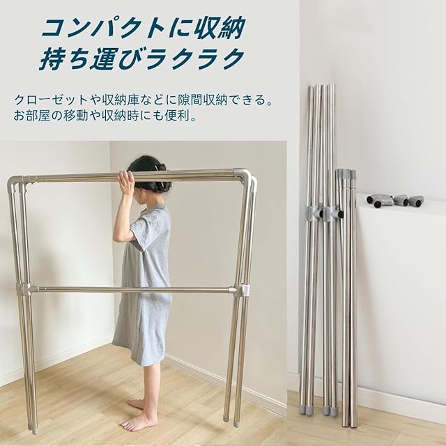 【高耐荷重で大容量】最大75kgの重量に耐えることができ、重い衣類やアクセサリーを掛けても揺れたり曲がったりすることはありません。家族はもちろん、1人暮らしのまとめ洗いにもおすすめ。ダブルバーで空気の通り道ができるから、短時間でふっくら乾かせる。ハンガー掛けを移動させれば、布団を干しても空いたスペースに洗濯物がたっぷり干せる。